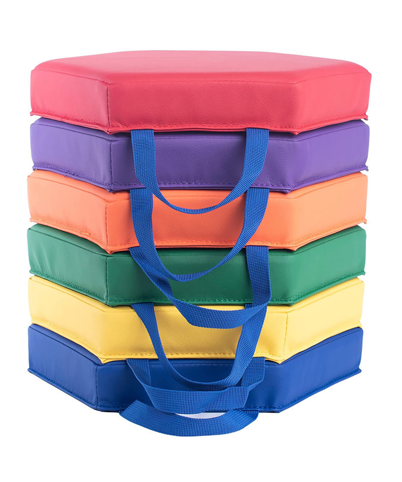 Spot markers help children recognize where it is appropriate for them to sit. The fun, color coded, cushioned markers encourage children to stay seated, while letting them fidget and shift, on the floor cushion. The cushions are versatile and can be used as stepping stones to help develop hand-eye coordination, balance, sensory processing, and body awareness. The floor cushions are durable and washable, making them very practical for home, and school use. The built in handle makes transporting them easy for young students. Set of 6 hexagon shaped floor cushions measuring 13" x 13" x 2".