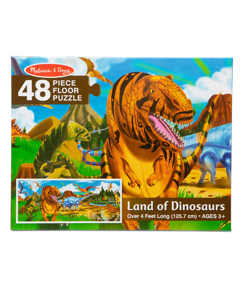 The dramatic, detailed dinosaurs on this cardboard floor puzzle may be long extinct, but these 48 puzzle pieces will surely last for ages! Four feet long when assembled, the extra-thick puzzle pieces feature an Easy-Clean surface to keep them looking like new. It's an educational and entertaining challenge for any child to complete the puzzle and name the dinosaurs.
