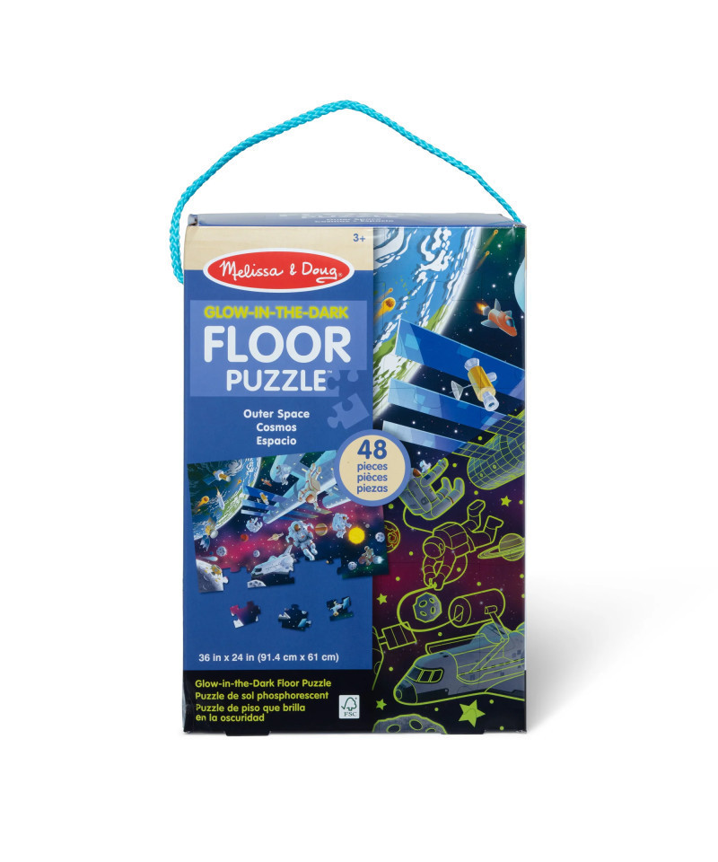 Piece together 48 sturdy jumbo cardboard jigsaw pieces for an experience that's out of this world! Assemble the detailed and colorful space scene in a brightly lit room. When the three-foot by two-foot puzzle is complete, turn out the lights and watch as hidden pictures and details appear in glow-in-the-dark ink! (The puzzle must first be exposed to bright light to activate the glow-in-the-dark feature.) Playing with puzzle is a great way for kids three and older to explore the fascinating world of outer space while developing their cognitive, physical, and emotional skills. When children work on floor puzzles, they are fine-tuning their gross motor skills, improving their hand-eye coordination, strengthening their problem-solving skills, and beginning to develop logic and critical thinking processes. This high-quality Melissa & Doug puzzle makes an exceptional gift for preschoolers and school-aged kids for hands-on, screen-free play.