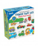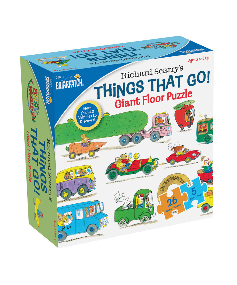 Richard Scarry Things That Go Giant Floor Puzzle. Five feet long and one foot tall. Learn the alphabet by completing the jigsaw puzzle and matching the letters with more than 40 wacky vehicles from Richard Scarry's Busytown! From Alligators to Zippers these funny cars teach the alphabet. Ages 3 and up. 26 easy-to-handle pieces make puzzling easy!