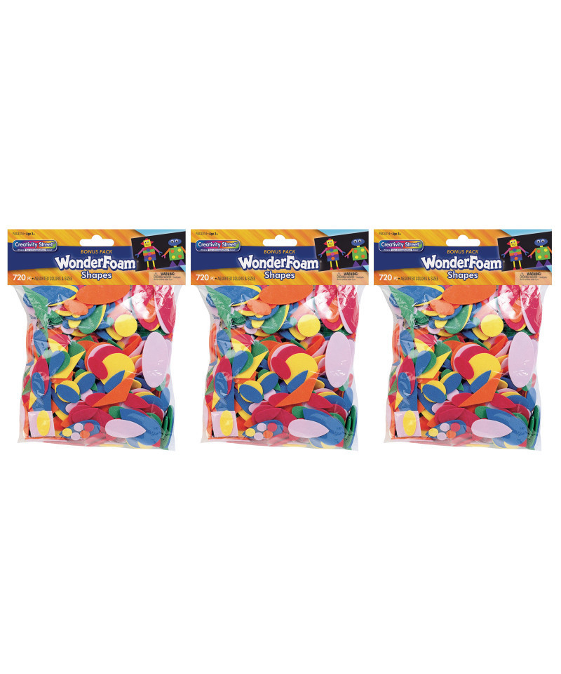 Bonus bag of 720 foam shape pieces in assorted sizes, shapes and colors. These WonderFoam shapes make craft projects or decorating fun. Each bag contains assorted shapes and sizes in bright assorted colors. Simply add glue and stick to any type of collage material. Sold as 3 packs of foam shapes.