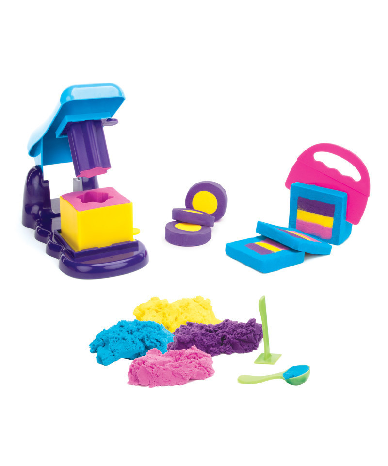 - INCLUDES: Three pounds of Playfoam Sand in four colors, a design station, cylinder and cube molds, three core molds, three shaped stampers, a cutter, and a scooper
