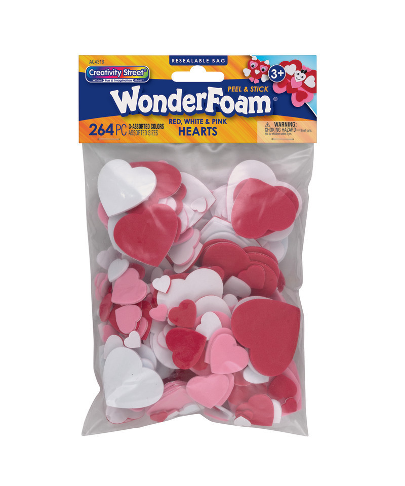Spread the love with WonderFoam® Peel & Stick Hearts—a delightful assortment of 264 foam hearts in charming red, pink, and white colors. With assorted sizes (up to 2" wide), these self-adhesive foam shapes are perfect for adding a colorful, dimensional touch to all your craft projects. The easy peel-and-stick backing makes decorating simple and mess-free—no glue required! Ideal for creating Valentine’s Day cards, scrapbook pages, collages, classroom crafts, and festive decorations, this versatile set is perfect for group activities, parties, and creative fun in any setting.