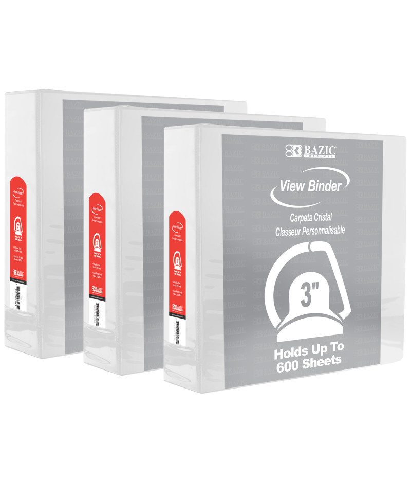 This 3 inch hard cover binder features a clear view on the front, back and side so you can customize! Each binder can be easily identified when a piece of paper with artwork or title is inserted from the opening on the top. This binder has 3 metal rings that are "D" shape, attached inside on the back of the binder, so that you can fit more documents. Sold as a pack of 3 binders.
