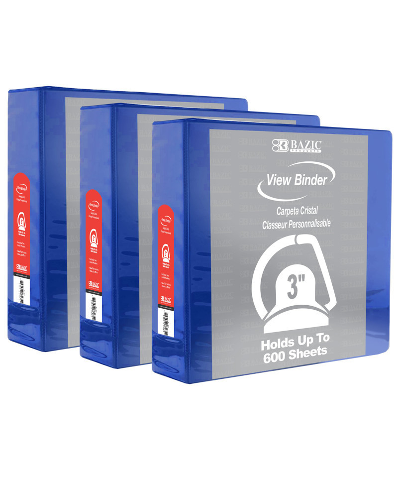 BAZIC Products® Slant D Ring View Binder with 2 Pockets, 3", Blue, Pack of 3