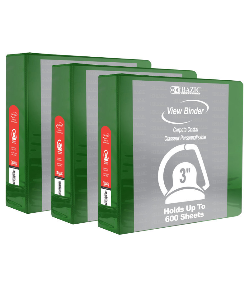 BAZIC Products® Slant D Ring View Binder with 2 Pockets, 3", Green, Pack of 3