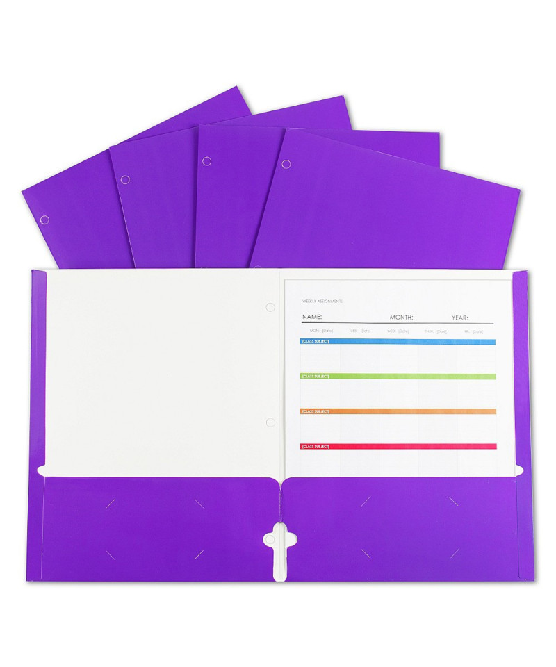 Two-pocket paper portfolios/folders with 3-hole punch hold papers and resist tearing. Laminated, high-gloss finish catches your eye. Vibrant colors let you organize by subject, project and more! Great for school, home or office. Folders feature 3-hole punch with 2 business card slots. Without prongs. For 8.5" x 11" document storage. Box of 25. Purple.