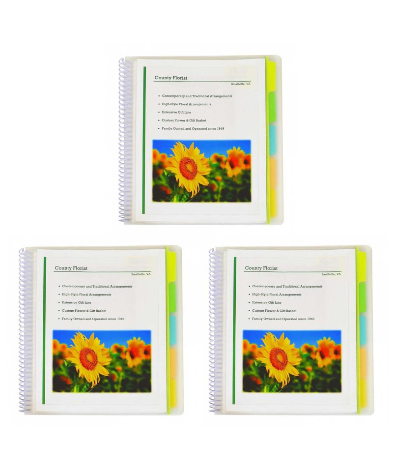 This spiral-bound organization product stores notes and documents in a protective holder. Suitable for both students and professionals, the sleek outer cover provides a stylish appearance to the portfolio. Organize projects, subjects, notes and more in one convenient place. Ten interior pockets allow for detailed organization. Write-on tabs make for quick and easy custom organization; works with pencil, ball point pen or permanent marker. Spiral-bound portfolio features clear-view front pocket for cover sheet. Made of heavyweight acid-free polypropylene. For letter size documents. Clear cover and pockets with assorted color tabs. Sold as a pack of 3 portfolios.