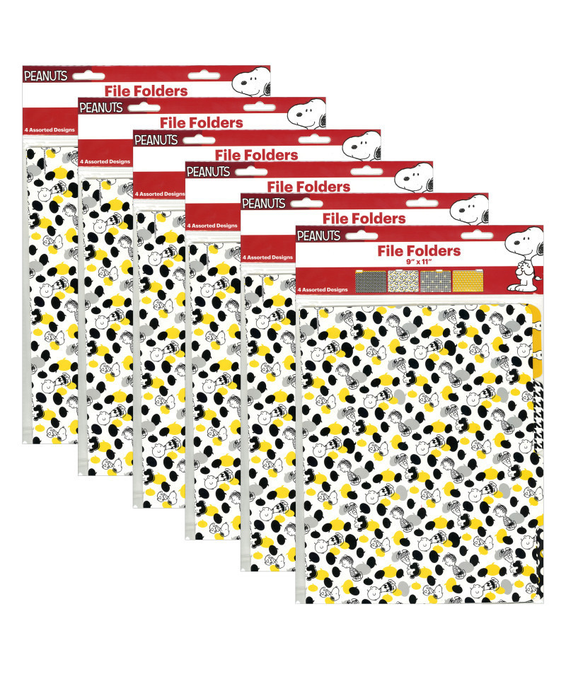 Peanuts® Touch of Class File Folders offer unique and creative solutions for classroom organization. Each file folder measures approximately 9" x 11.5". Each pack includes 4 file folders (1 each of 4 different designs). Sold as 6 packs for 24 file folders total.