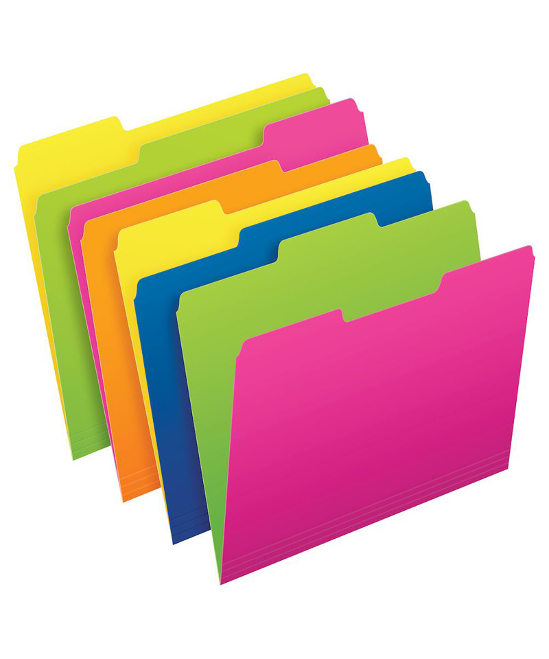 Pendaflex® Twisted Glow File Folders reverse to mismatched neon colors for twisted color-coding fun. Reversible folders in neon blue/yellow, green/pink, green/yellow and pink/orange color combos. 1/3-cut in assorted tab positions. Letter size. Pack of 12.