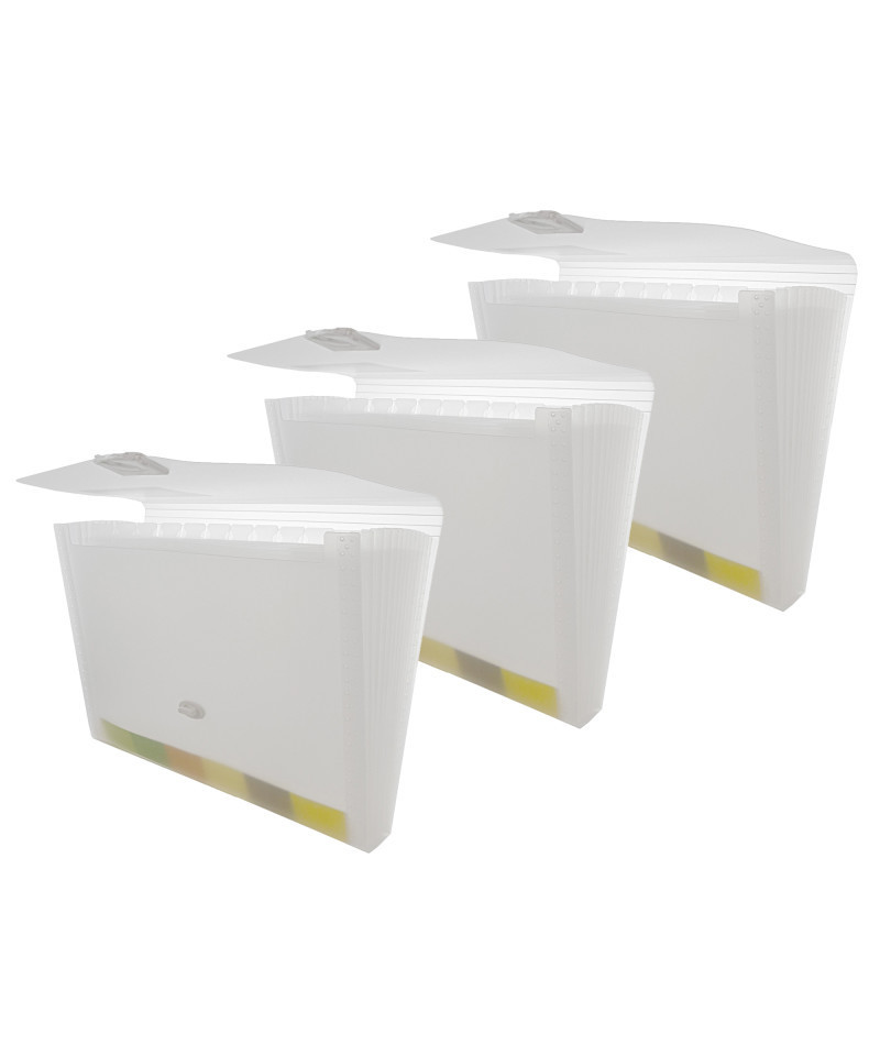 Made from high quality Polypropylene (PP) Plastic material. Safe and non toxic. Expandable with 13 pockets, along with small colored labels helps classify by subject. Fits both A4 Size and Letter Size. Durable construction with 0.6 mm thickness spectrums for long lasting use. Organize your paper, important files, contract, sales report, presentation, receipt, checks, bills, documents, vouchers, cards, paint work, homework, assignments. Lightweight, flexible, tear resistant, and waterproof. Holder features snap closure for quick access and secure your document. For office, school, home, travel, business trip. Measures 13" x 9.5" x 1.75". Sold as a pack of 3 expanding files.
