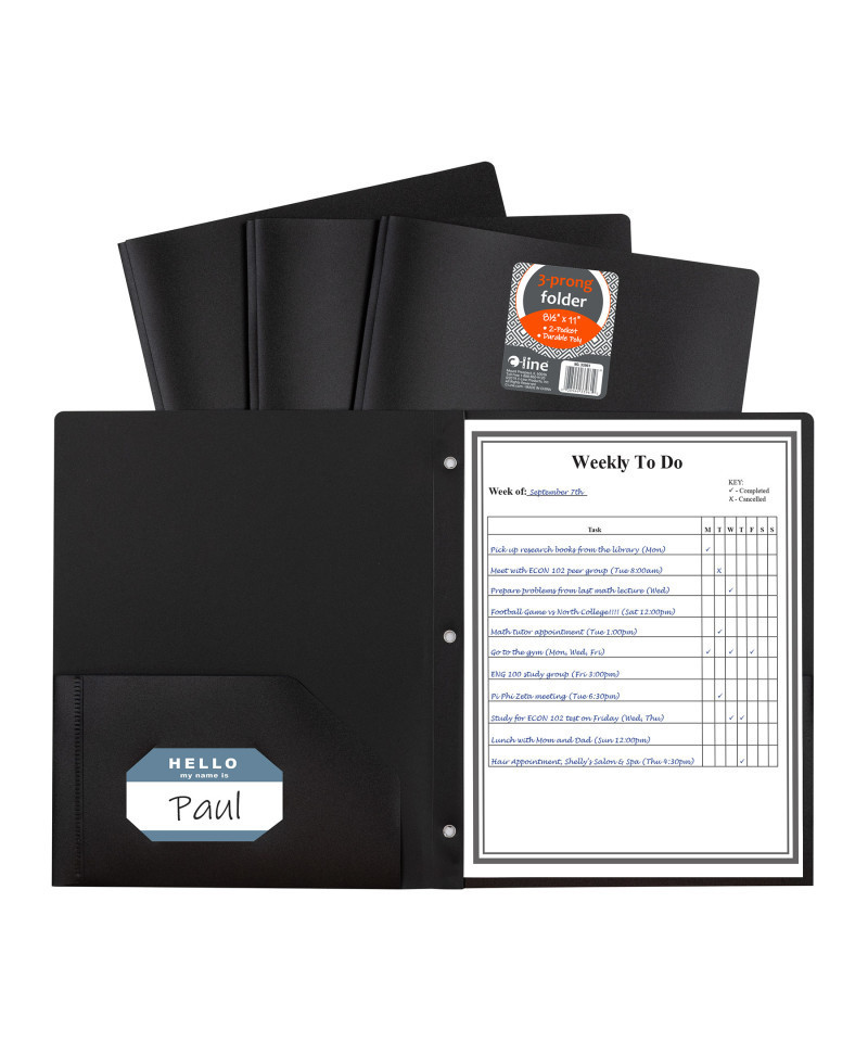 Two-pocket heavyweight polypropylene portfolios / folders hold papers and resist tearing. Features business card slot. With prongs. Black. Sold individually.