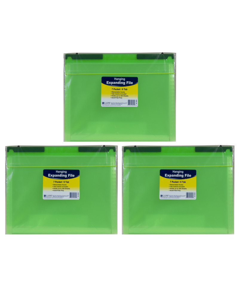 Combine the function of an expanding file with a filing cabinet by using the versatile Expanding File with Hanging Tabs. This file itself is a storage system offering a variety of uses. Great way to organize letter-size documents within a 7-pocket file. Use the retractable hanging tabs to secure the file inside a filing cabinet. Transport documents with ease by sliding the hanging tabs back into place and using the elastic closure to secure pages. Made of heavyweight polypropylene, the file has insertable preprinted tabs that help sort documents. Sold as a pack of 3.