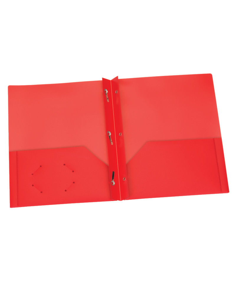 Colorful, flexible and durable for multiple uses. Lightweight poly resists wear and tear to help keep your work safe. Built-in, 2-prong fasteners hold up to 35 letter-sized 3-hole punched sheets. Twin-pocket folders hold up to 50 sheets in each pocket. Interior die-cut business card holder keeps contact info close at hand. Red; 25 per box.