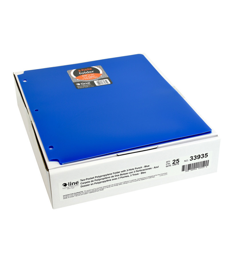 Need some help keeping your three-ring binder in order? With the help of these specialty two-pocket folders, letter-size papers can stay organized, while still remaining accessible. Two-pocket heavyweight polypropylene portfolios/folders with three-hole punch hold papers and resist tearing. Features three-hole punching for secure storage in standard 3-ring binders. Cut-outs at the top and bottom keep portfolio from being caught in binder open-close mechanism. Blue. Sold as a pack of 25 folders.