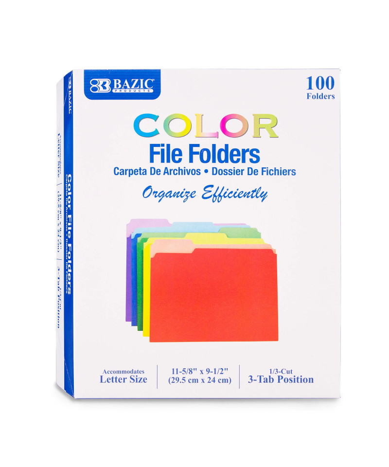 - COLOR FILE FOLDERS. Each box includes Letter Size color file folders in vibrant colors. A reliable solution for everyday filing and organization needs. File folder measures 11-5/8" W x 9-1/2" H.