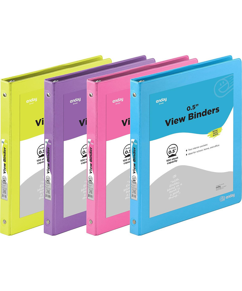 The customizable 0.5-inch 3-ring binder is the perfect organizational tool for home, school, or office use. Sold as a 4-pack in assorted colors, these binders are ideal for color-coding by subject or project, making them both kid-friendly and professional. Lightweight and compact, they are designed for efficient storage while offering a tear-resistant cover to ensure durability and a like-new appearance over time. The transparent, non-stick overlay on the front, spine, and back cover allows for easy customization, making it simple to label and identify even when stored on a crowded shelf.