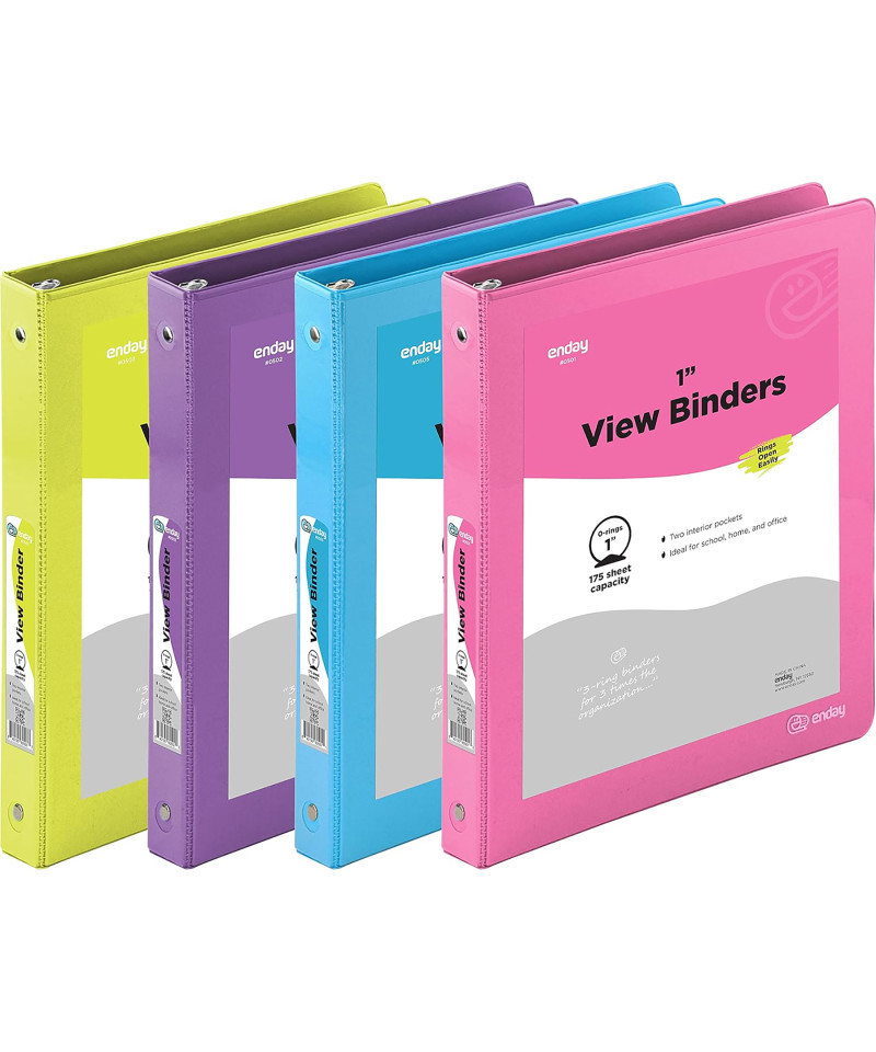 The customizable 1-inch 3-ring binder is the perfect organizational tool for home, school, or office use. Sold as a 4-pack in assorted colors, these binders are ideal for color-coding by subject or project, making them both kid-friendly and professional. Lightweight and compact, they are designed for efficient storage while offering a tear-resistant cover to ensure durability and a like-new appearance over time. The transparent, non-stick overlay on the front, spine, and back cover allows for easy customization, making it simple to label and identify even when stored on a crowded shelf.