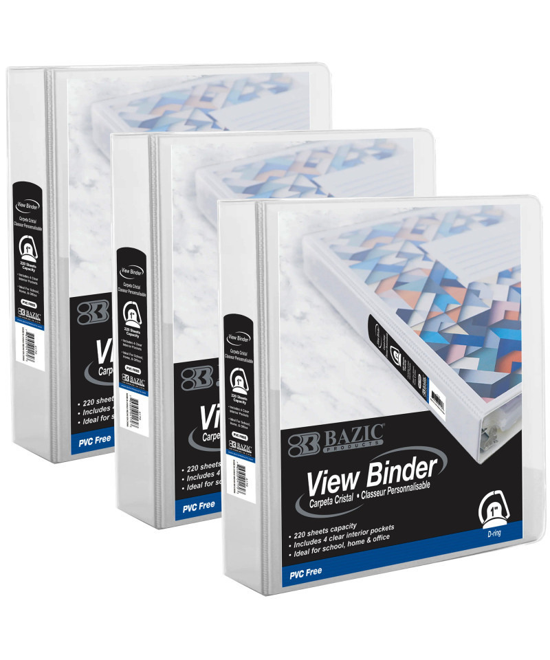 BAZIC Products® PVC-Free Slant-D Ring View Binder with 4-Pockets, 1", White, Pack of 3