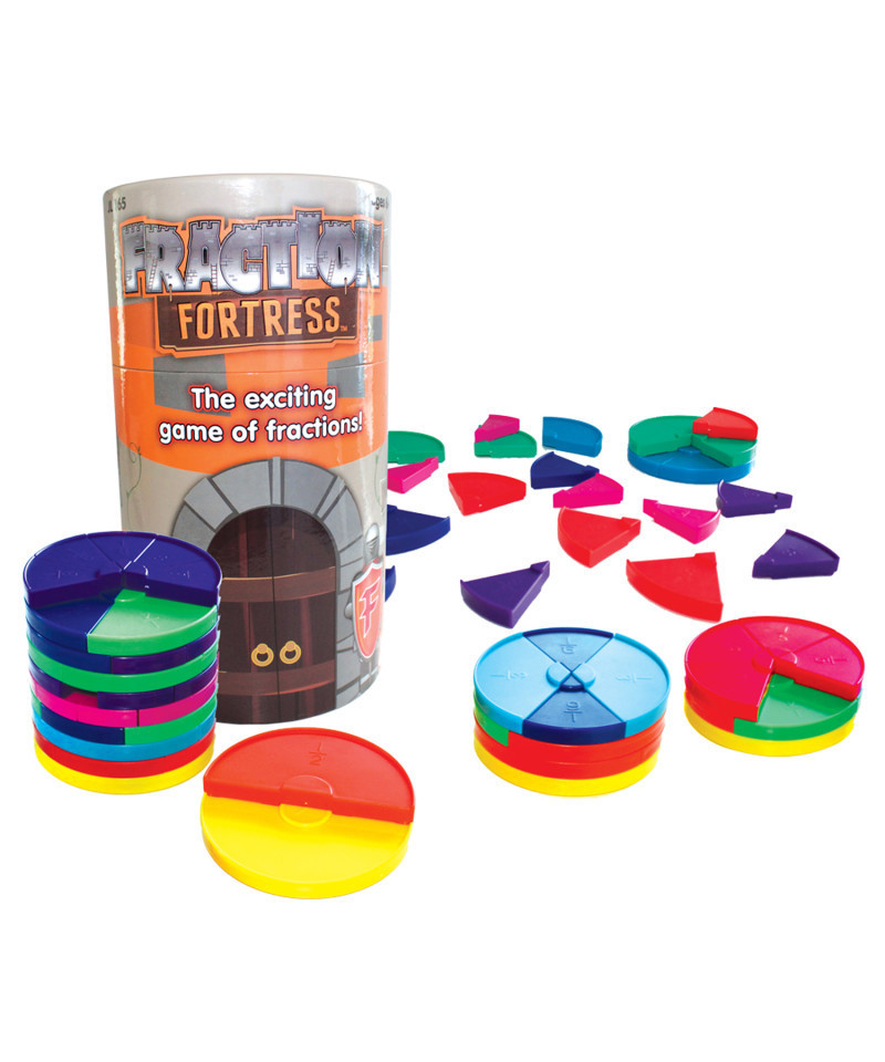 The exciting game of fractions! Stack your Fraction Fortress with as many fraction wholes as you can to win. Challenge your friends to see who can stack the highest tower wins. Includes 76 fraction blocks, spinner and game guide.