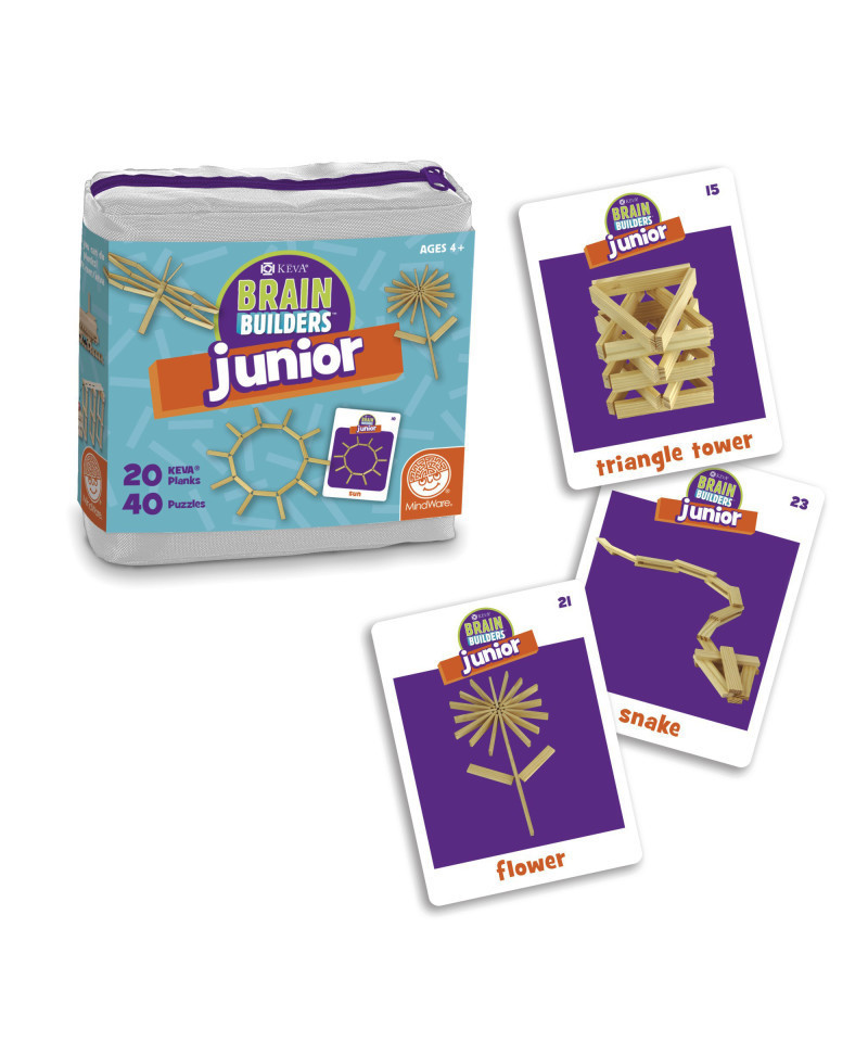 - KEVA® Brain Builders Junior is a great first step towards STEM. Features photos of fun, recognizable objects to replicate for those 4 and up.