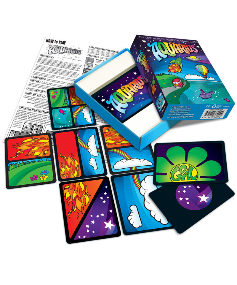 Aquarius, the Looney Labs game of elemental connections, is one of our longest-running titles! Kids love the colorful design, fast play, and familiar matching strategy. Adults love the game's competitive edge. It's the perfect family card game. Players take turns playing element cards, trying to get seven connected of their secret goal element. But look out for special actions that might change your goal, give your entire hand to someone else, or otherwise upset your well-laid plans! For 2-5 players, ages 6 and up.