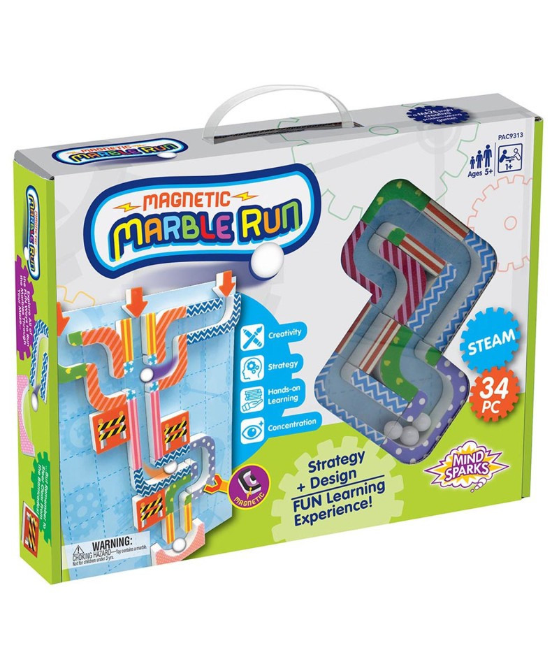 Reinforce critical and logical thinking, along with spatial ability, patience and color/shape recognition with Mind Sparks® Magnetic Marble Run! Versatile, multi-level STEAM activity for kids of all ages beginning at 5+, perfect for home and classroom use! This 34 piece set includes 1 magnetic board, 13 durable magnetic tracks, 9 multi-level cards ranging from easy to challenging game play, 4 magnetic arrows, 3 white marbles, 3 magnetic obstacles and 1 answer key. Packaged in a reusable, retail-friendly storage box with product-viewing window and convenient carrying handle, this activity is sure to keep children engaged for hours!