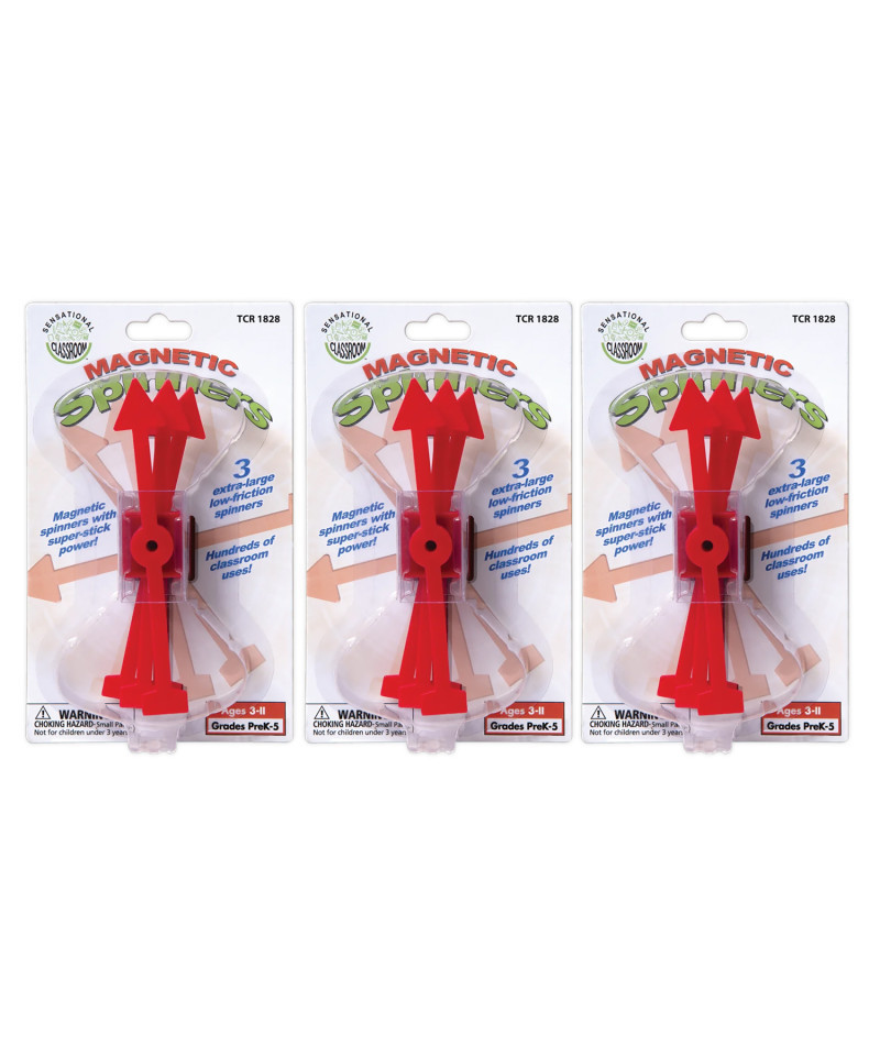 Want to play some spinner games with the whole class or small groups? These three 5" jumbo spinners have strong magnetic bases, making them ideal for creating spinner games on a magnetic white board. Choose players with a spin. Choose any information to start the game with a quick spin at the board. Works great on any magnetically receptive surface. Each pack includes 3 spinners. Sold as 3 packs for a total of 9 spinners.