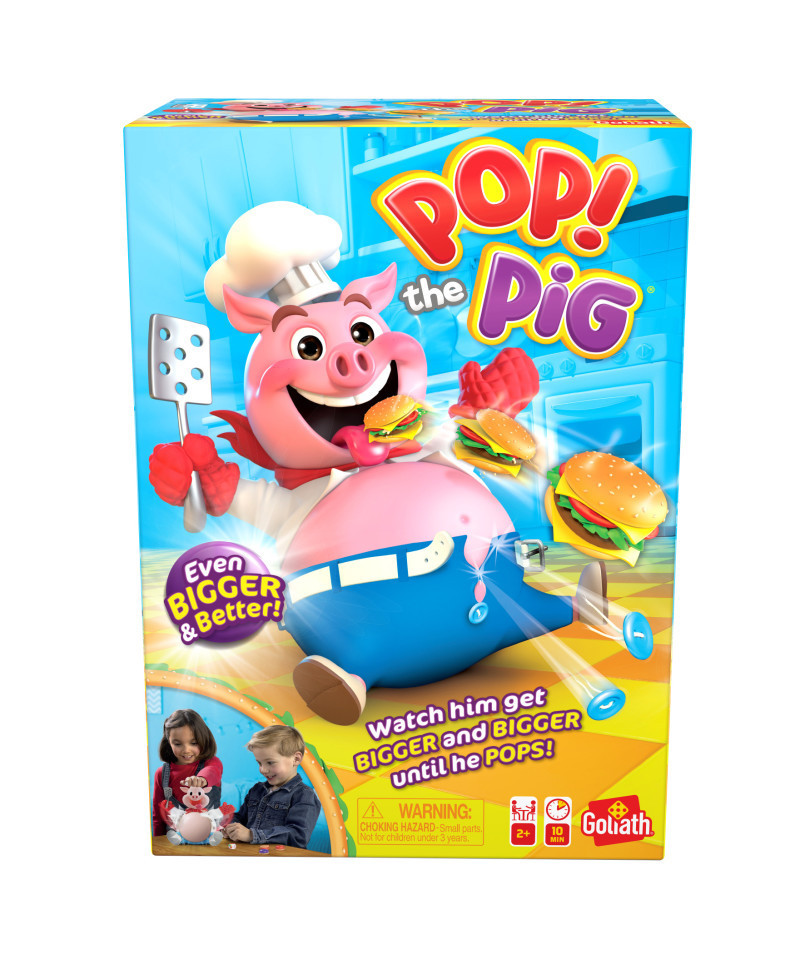 Pop the Pig is an international preschool classic that is adored by millions of children - it's been a top-selling preschool game according to data collected by NPD! Kids spin the spinner, pop a hamburger into the pig's mouth and push down on his head. The more they pump, the more his belly grows until . . . pop! Kids love the suspense as they watch his belly grow; the player who makes his belly burst wins the game. Children can quickly reset the game with one pump of the pig's head and experience consistent belly-busting gameplay each and every time. Pop the Pig provides hours of fun and is completely kid powered (no batteries needed). For added convenience, all pieces can be stored inside the pig. For 2-6 players, ages 4 and up. From the makers of Doggie Doo, Gooey Louie, Jumping Jack, Catch the Fox, and Googly Eyes.