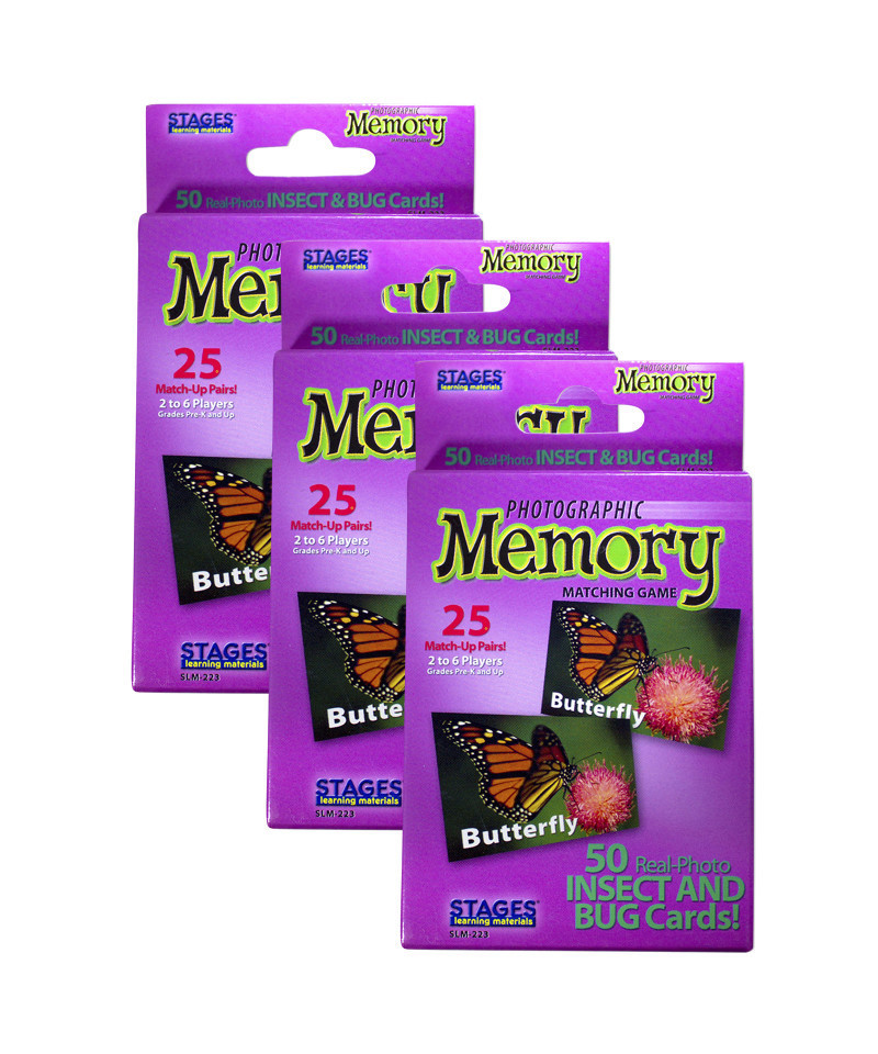 Butterfly goes with Butterfly... I WIN! Help your children build memory skills in a fun, innovative way by matching colorful, realistic photographs. No reading is required, but cards include the name of the picture to promote early sight reading. This is a great new photographic twist on a time-honored game. Each game includes 50 Cards - 25 matched pairs. 2 - 6 players. Pre-K and Up. Sold as a pack of 3 identical matching games.