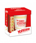 Play with your food in this delicious version of the classic "Shake, Score & Shout" dice game! YAHTZEE® Cup Noodles serves up instant fun and nostalgia with custom dice featuring your favorite flavors: Chicken, Beef, Shrimp, Lime, Corn, and Carrots! Roll the right ingredients to score big or try for a YAHTZEE that's "Much More Than a Soup"! Caution: Competition gets heated. For 1 or more players, ages 8+. Contents include: 5 Custom Dice, 1 Custom Cup, Scorepad, and Rules.