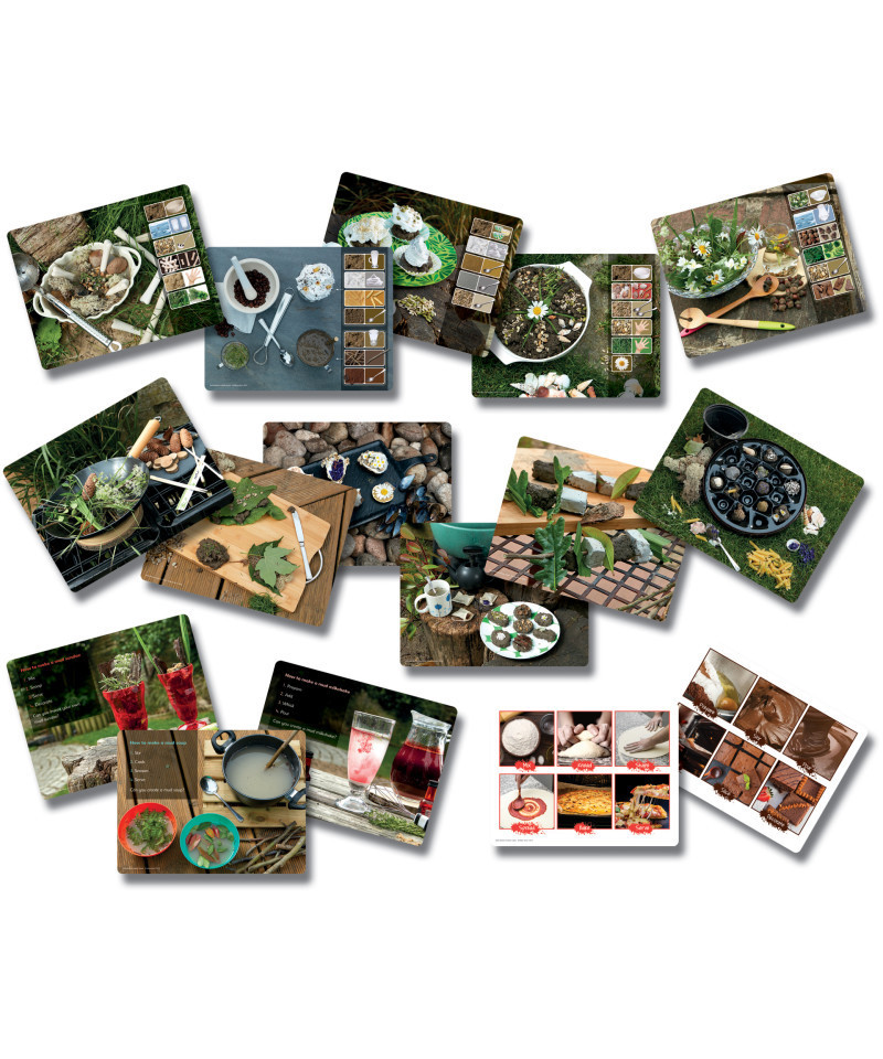 Inspire children to get creative in the mud kitchen! With lots of muddy recipes to choose from, including a Gruffalo stew, seafood platter, and the classic mud pie, children will be eager to get mixing, blending, baking and creating! Each card includes beautiful photographic images on one side with activity prompts, vocabulary and extension ideas on the reverse. Made from durable plastic, any muddy splashes can be easily washed away. Each set includes 16 double-sided cards measuring 8" x 11". Age 3+.