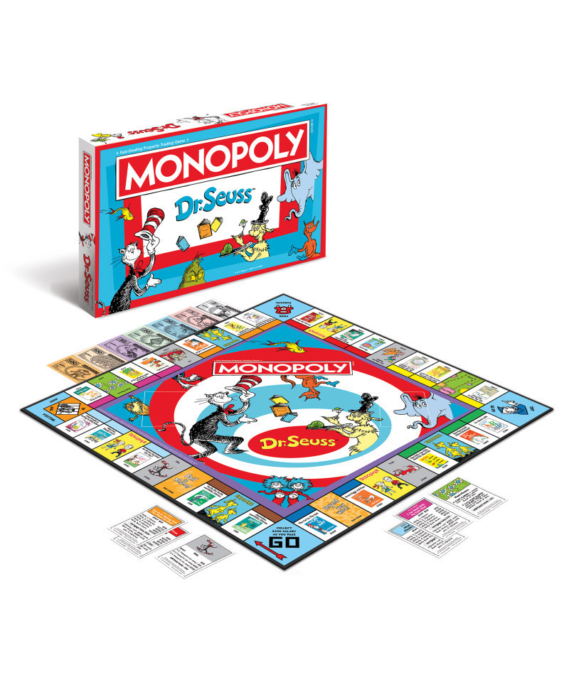 Get ready to rhyme with this ultimate game for Dr. Seuss fans! MONOPOLY®: Dr. Seuss lets generations of fans relive their favorite childhood books as they buy, sell, and trade unforgettable titles from the author's collection, such as The Cat in the Hat, Green Eggs and Ham, and The Lorax! Set up Libraries and Book Stores to secure your valuable works as you travel the board with tokens of iconic story objects. Stack up Dr. Seuss character-faced currency and be the last player with cash to win! For 2-6 players, ages 8+.