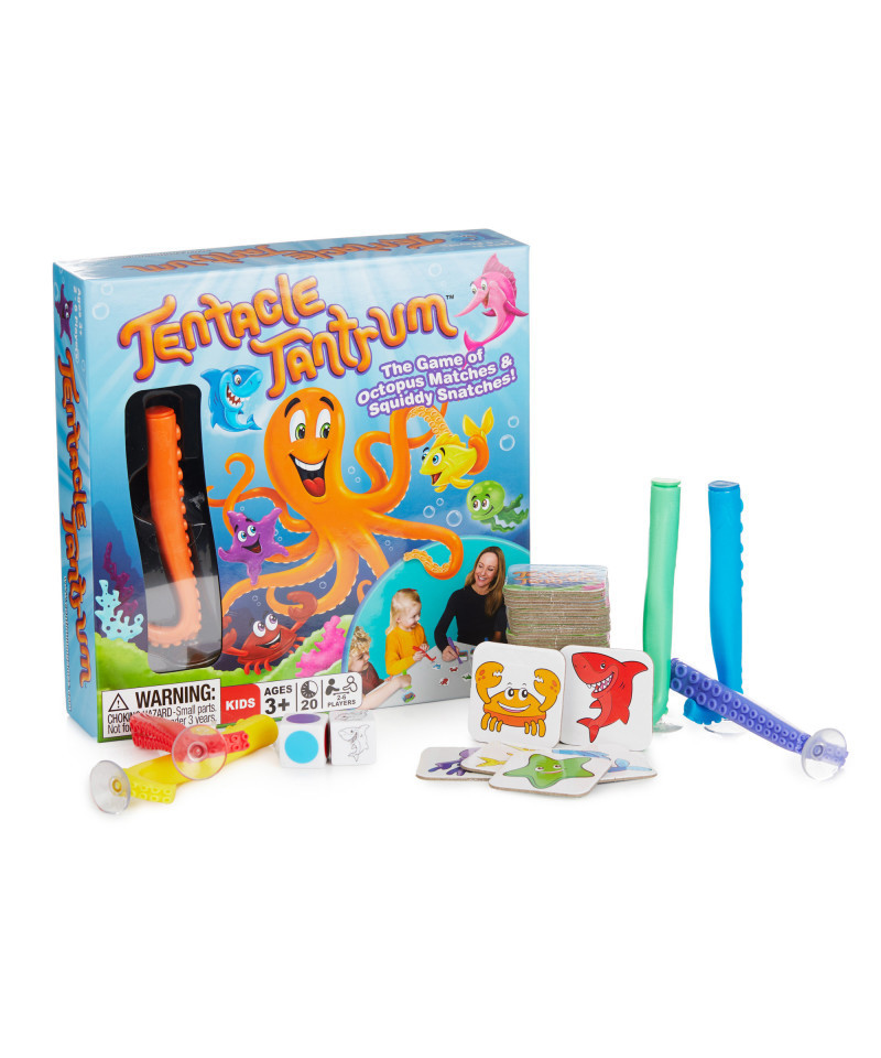 Get your tentacles ready for a freaky fish frenzy! Roll the dice and snatch matching sea creatures with the suction cup on the end of your squiddy octopus arm! Match by color or match by kind, but snatch 'em up quick! If you catch the most, have a fit! You win Tentacle Tantrum!