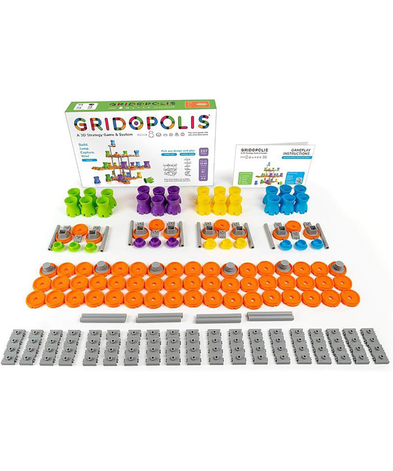 The world's first 3D strategy game that you build & play. The game's objective is to be the last player standing or have the most points at the end of a timed game. On your turn, you can move, jump OR build! That means the grid-set, which is your three-dimensional playing arena, changes during the game. Gridopolis is simple and easy to learn, as well as a dynamic compelling challenge to master. Gameplay rules based on classic games such as chess, checkers, and tic-tac-toe. For 1-4 players, includes 217 high-quality pieces, enough to build hundreds of unique boards. With 7 basic parts, you play, build, modify, and expand the grid-set. This high-quality board game is fun for the whole family!