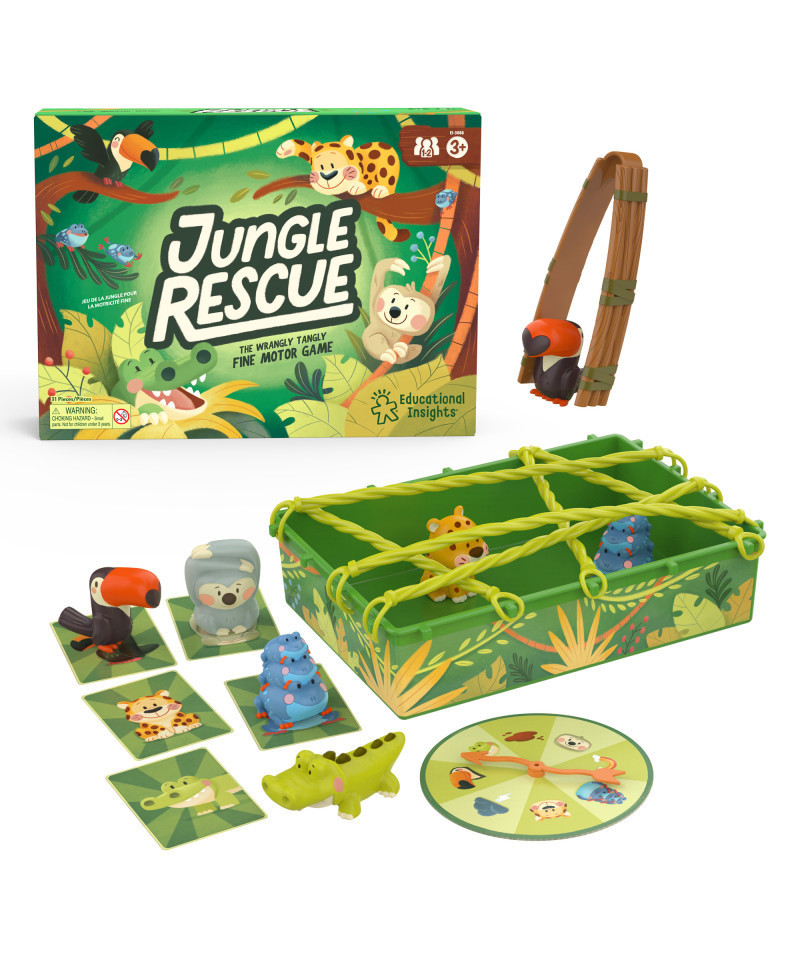 Use fine motor skills to rescue your jungle friends from the tangly vines! The first player to collect one of each animal wins. Includes ten animal game pieces, ten cards, eight customizable vines, tweezer tool, game bin, spinner, and guide.