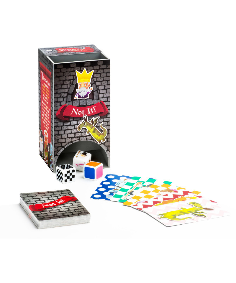 Spot the card that does NOT match! Do it fast... Do NOT be last! Can you find a card in your hand that does not match any of the attributes revealed on the 3 dice that tumble from the dice tower and onto the table? Find it as quickly as you can and slam it on the table and yell, "NOT IT!"