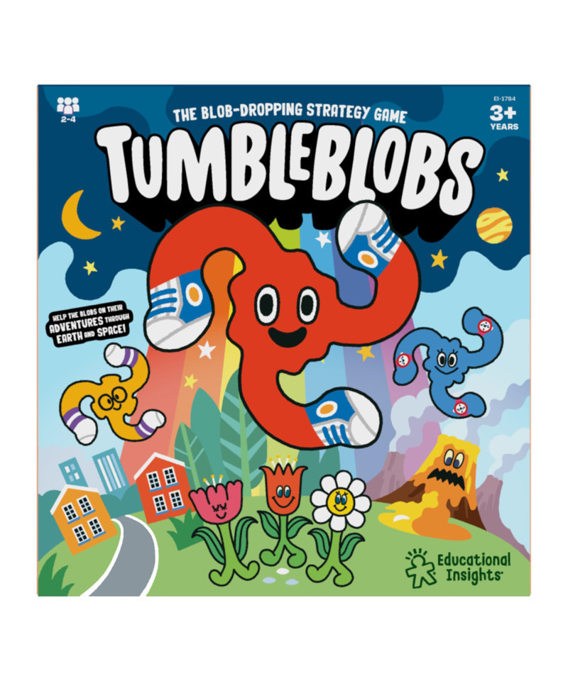 The Tumbleblobs have tumbled into your world and need help on their adventures through space and on Earth! Help the blobs complete blobstacle courses by dropping them from the top of the board and try to catch the pegs on the board. Each blobstacle course has a different goal, from color matching to counting to strategy! Includes game board with pegs, three double-sided scene cards, 16 blob player pieces (two sets of eight), and guide. For 1-2 players, ages 4+.