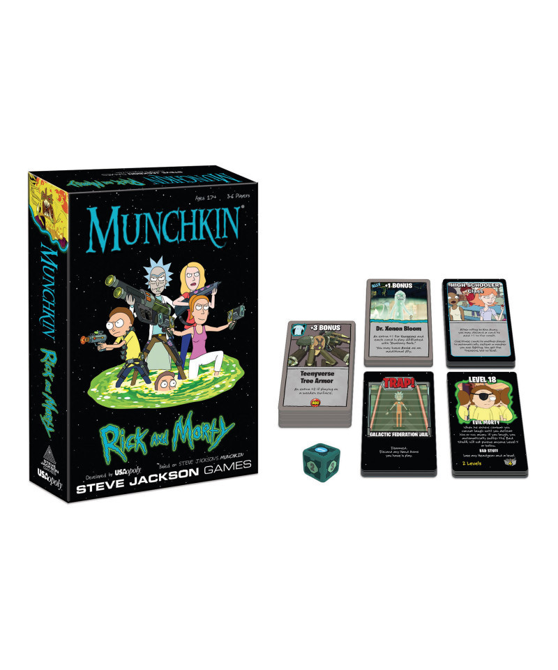 Munchkin: Rick And Morty fuses the classic card game fun of monster-slaying and role-playing with cyborgs, aliens and demons from the popular television series, Rick And Morty. Play as Rick, Morty, Beth, Jerry, Summer or Mr. Poopybutthole to defeat the greatest adversaries in the Rick and Morty universe and become the hero as you reach Level 10 for the win.