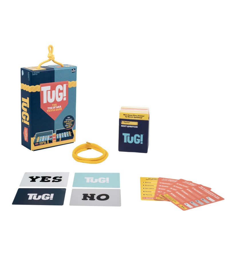 Tug of war isn't about muscle anymore in this fast-paced trivia game. Answer yes-or-no questions with your team, and tug that rope whenever your team is the only one that's right! If both teams answer correctly, it's a wash and it's time for the next question. With more than 1,400 trivia questions and multiple ways to play, you'll always be ready to tug the rope to victory. Features a specially-designed box that hides the answers so everyone can play at the same time! Includes 121 Double-Sided Cards (1,400+ Questions), 1 Rope, 1 Flag, 1 Question Revealer, 1 Built-In Game Board, and Complete Instructions. Recommended for 2 or more players, ages 12 and up.