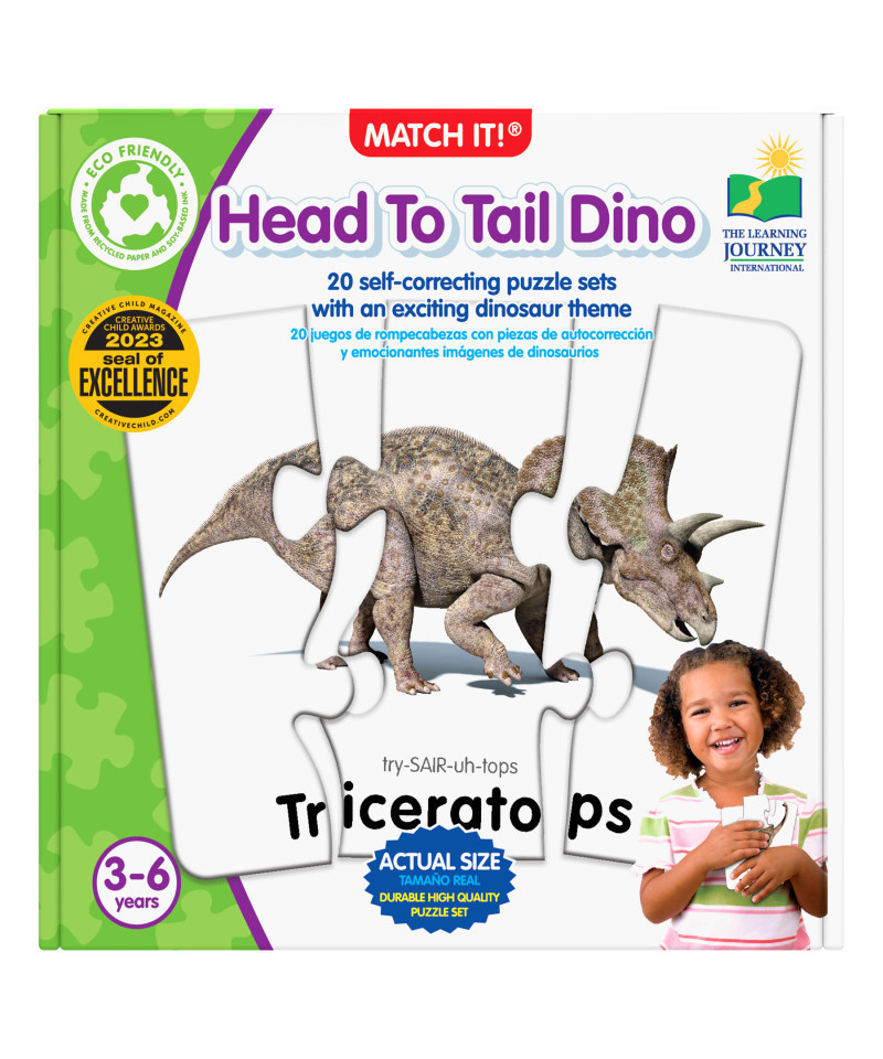 Kids love dinosaurs and this colorful set of 20 dinosaur puzzle cards provides children with an excellent introduction to these prehistoric creatures. Each card features a picture of a dinosaur's head, mid section, and tail. Simply match the heads, mid section and tails to complete the puzzle. The puzzles are self-correcting as no two puzzle cuts are the same. Ages 3-6 years.