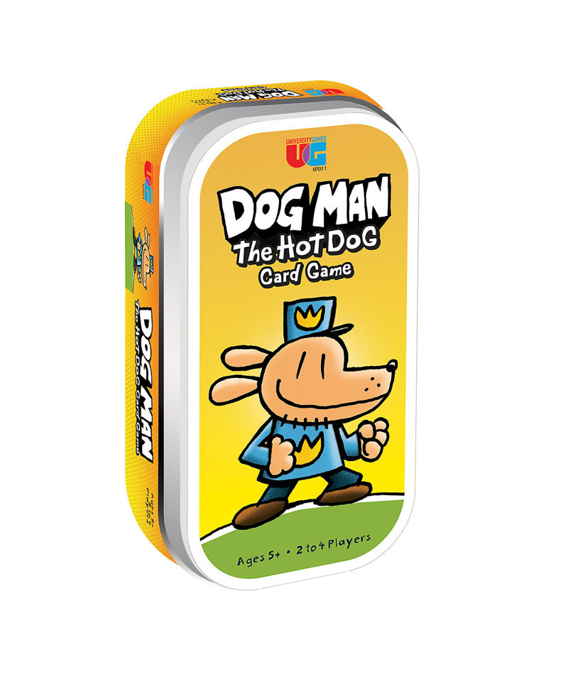 Get ready for a sizzling adventure with the Dog Man Hot Dog game – the ultimate game for Dog Man lovers and hot dog fans alike! Step into the paws of Dog Man, the beloved half-dog, half-man hero, as he chased hot dogs. Petey sprayed all the hot dogs with 'living spray' and they all came to life. Dog Man LOVES Hot Dogs. The player who collects the most hot dogs wins in this fun card game based on the popular book series by Dav Pilkey. With colorful graphics, exciting gameplay, and a dash of humor, the Dog Man Hot Dog game is perfect for kids and families who enjoy a good challenge and a lot of laughs. The Dog Man Hot Dog game is perfect for game night and designed for 2 to 4 players, ages 5 and up. Enclosed in a travel size tin, this game is not only entertaining but also convenient for on-the-go play during trips or outings. For 2-4 players, ages 5 and up.