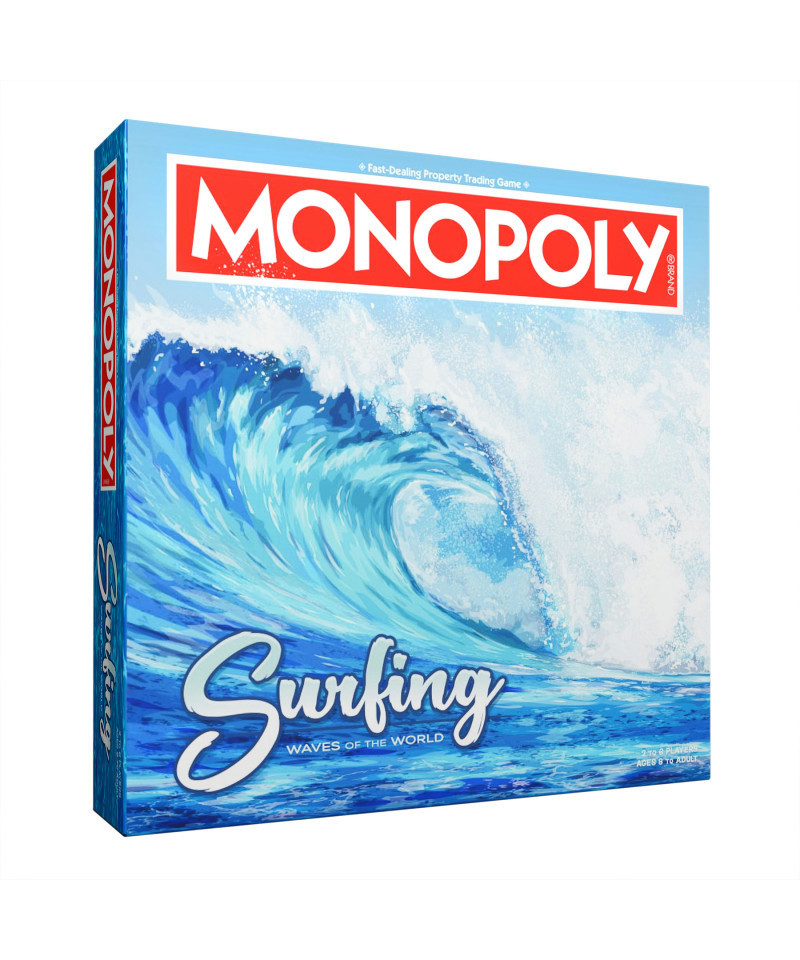 Ride the waves of fun and competition in MONOPOLY®: Surfing! Buy, sell, and trade iconic surf spots like Cocoa Beach, Pipeline, and Superbank . Featuring 6 custom sculpted tokens – a surfboard fin, board shorts, a dolphin, and more! Dive into Community Chest and Chance cards that bring unexpected challenges, like catching the perfect wave or facing a gnarly wipeout. Gather your friends, and may the best surfer claim victory!