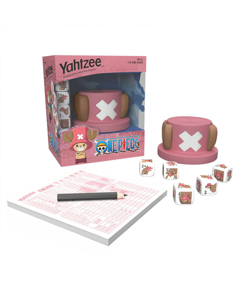 Set sail for adventure with Yahtzee®: One Piece – Chopper Edition, a special twist on the classic dice-rolling game featuring the beloved reindeer doctor , Tony Tony Chopper! This collectible edition brings the excitement of One Piece to your tabletop with a Chopper - themed dice cup designed to resemble his iconic hat-wearing head, along with custom dice showcasing his different transformation forms, from Brain Point to Monster Point. Roll your way to victory by matching the best combinations, from Full House to Five of a Kind, as you harness the power of Chopper's Rumble Ball transformations. Gather your fellow pirates and see if you have what it takes to roll the ultimate Chopper Yahtzee! Includes Custom Chopper Dice Cup, 5 Custom Chopper Dice, Custom Score Pad, Pencil, and Rules.