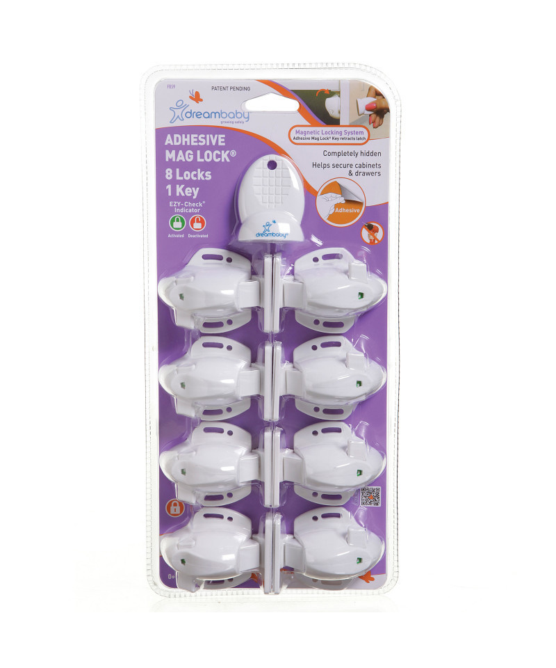 Dreambaby® Adhesive Mag Locks®, one of the best safety items on the market, are sturdy, invisible, and completely user-friendly. They adhere to the inside of opening furniture, like cabinets and drawers. Completely out of sight, they help ensure safety without producing eye-sores or tempting curiosity. The secret to the design is a powerful self-locking mechanism which is simple and easy to use. These unobtrusive locks feature an adhesive backing and come with a template for painless installation. Each pack includes 8 locks and 1 key.