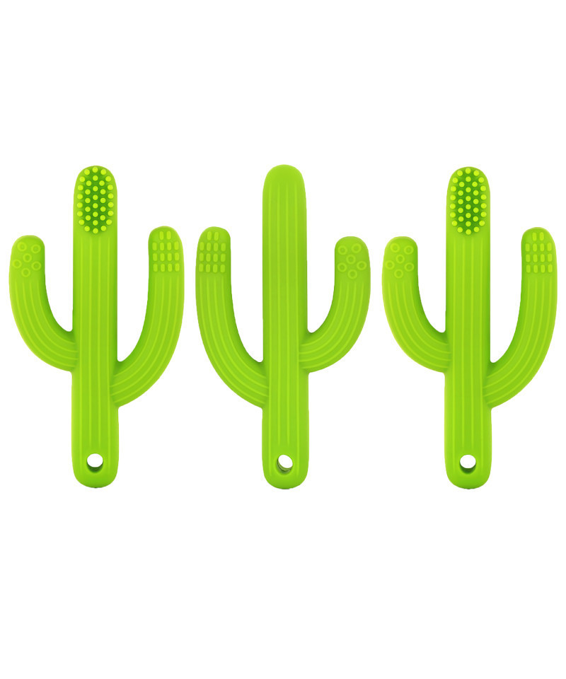 Green Cactus Toothbrush Teether features three different teething surfaces help teeth grow in healthy, sooth sore gums, keep baby stimulated and promote oral hygiene. Soft, silicone elastic bristles clean the mouth and reduce bacteria. Round and Long Massage Points massage the gums to effectively relieve teething discomfort. 100% safe! Made of FDA approved, non-toxic, food grade silicone. Free of BPA and Phthalates. Easy grip for small hands to help develop motor skills. Sold as a pack of 3 teethers.