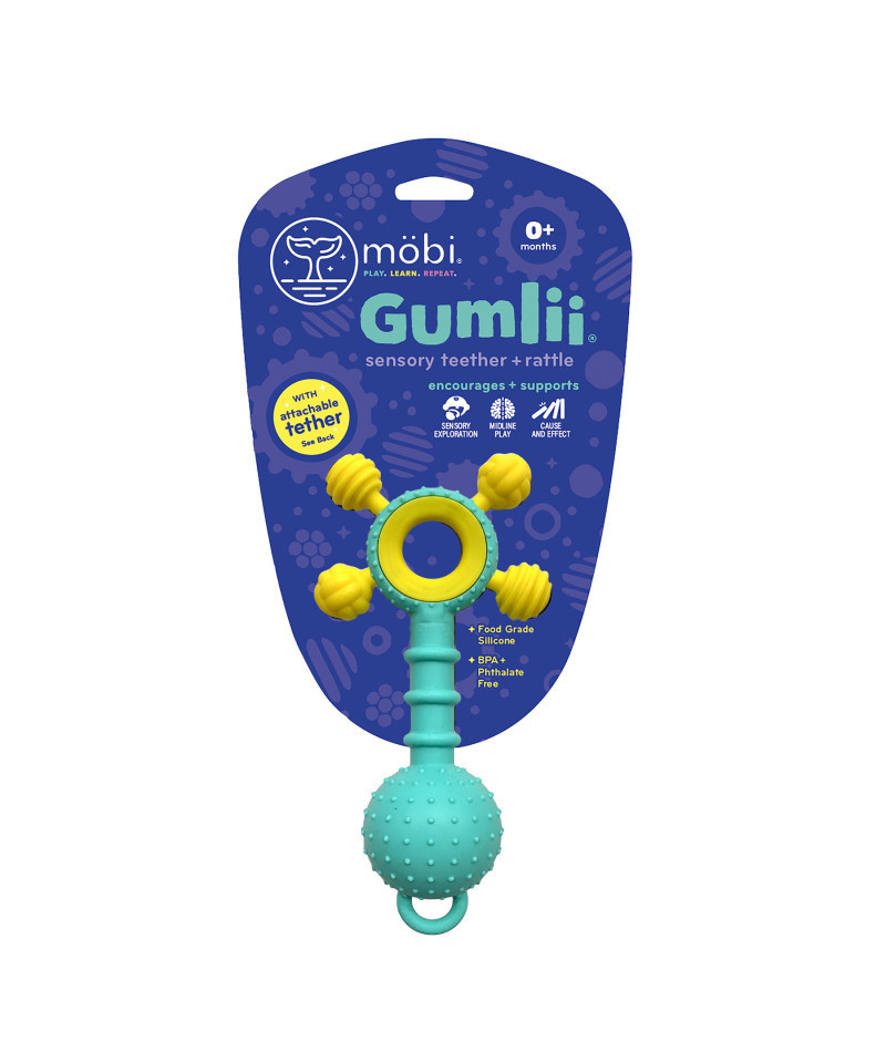 - Gumlii comes with an attachable tether so that caregivers are able to attach it to a highchair, baby carrier or stroller!