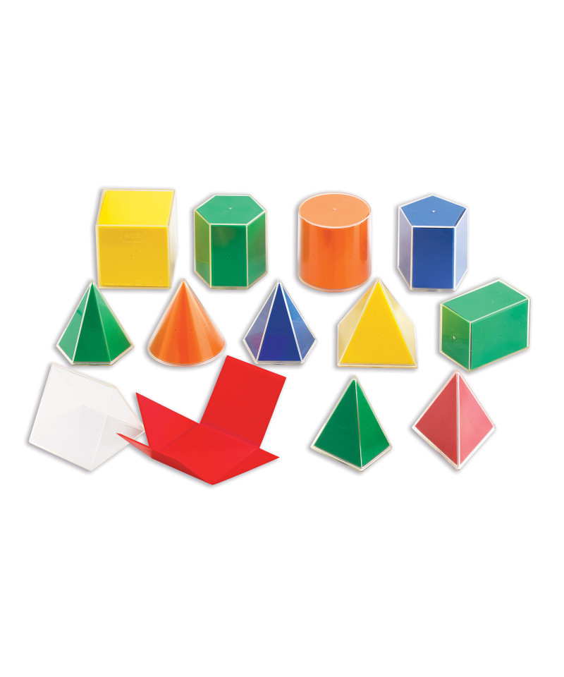 Set of 12 folding 2D3D geosolids including cube, cylinder, cone, triangular prism, square pyramid, triangular pyramid, rectangular pyramid, pentagonal pyramid, hexagonal pyramid, rectangular prism, pentagonal prism, and hexagonal prism. Ideal for exploring the properties of 3D solids, relationships between 2D shapes and 3D solids, volume and capacity, and surface area. Includes 12 solids made of durable plastic with rounded corners and edges, and 12 corresponding folding nets made from flexible plastic. Excellent hands-on tool for teaching and exploring volume, surface area and 2D3D properties. Compare volumes of different solids with the same height. The solids have an 8cm base. Activity guide included.