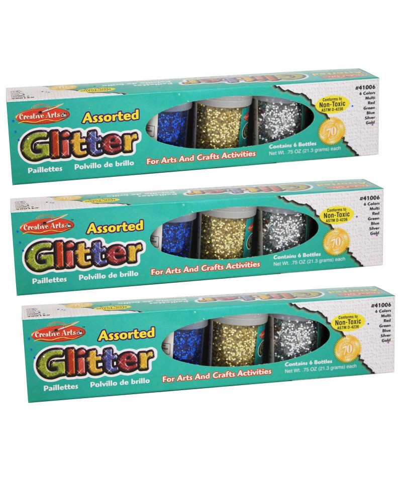 Brighten up any arts and craft project with these shimmering glitter flakes. Easy to use: Spread adhesive on any surface and then sprinkle glitter from our convenient shaker container. Each set includes 6 different colors in 3/4 oz. containers. Sold as 3 packs for a total of 18 containers.