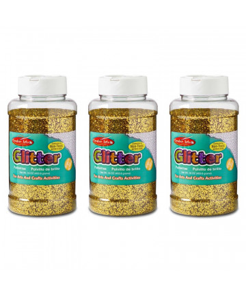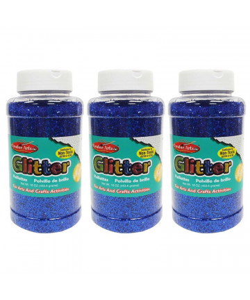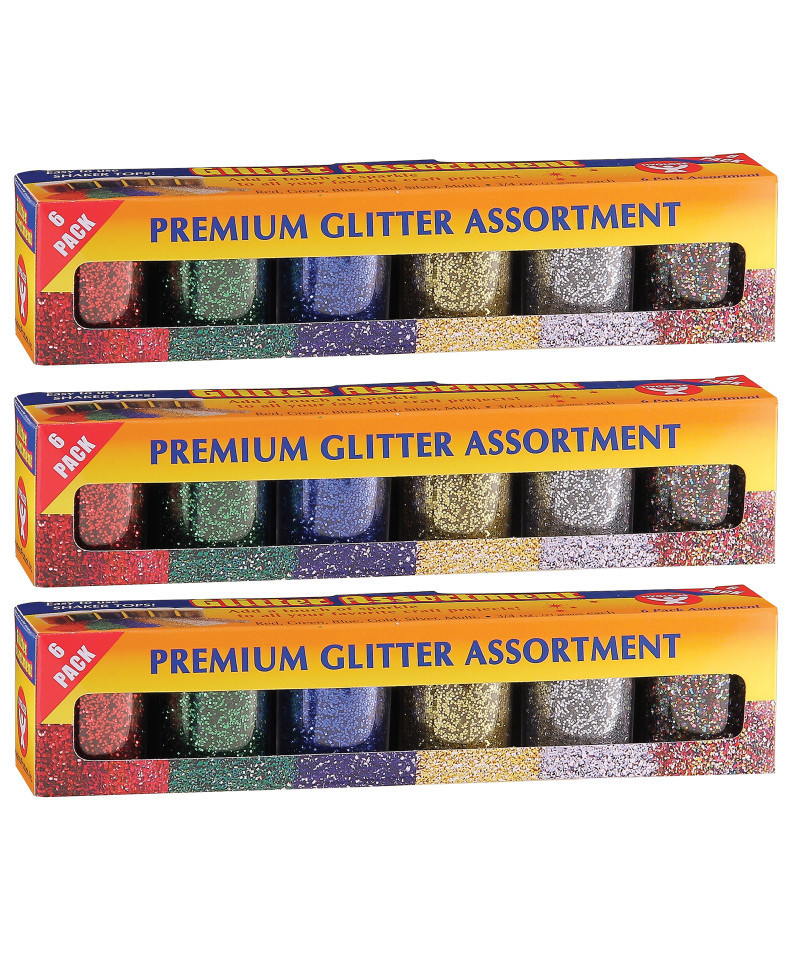 Vibrant colors in sparkling high quality glitter can be used with virtually any craft project. This traditional medium is used by young and old crafters for both simple and complex craft and hobby projects. Each pack includes 6 jars (0.75 ounce each) of glitter in assorted colors: Red, Green, Blue, Gold, Silver, and Multi-Colored. Sold as 3 packs for a total of 18 jars of glitter.